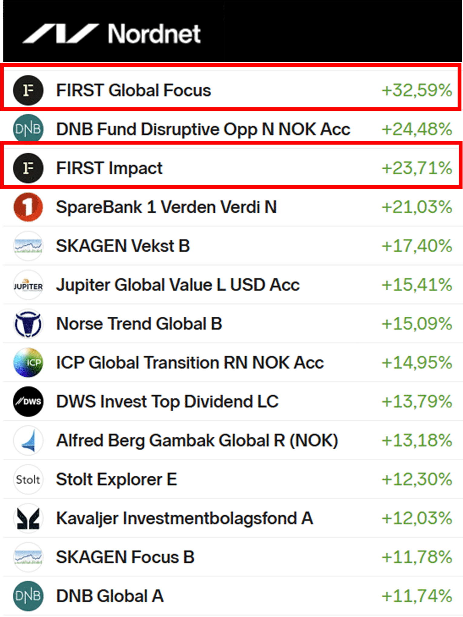 For 2025, så havnet FIRST Impact på 3. plass på Nordnet sin liste over 114 globale aksjefond, slått av søsterfondet FIRST Global Focus (1. plass med en avkastning på 33%) og ett fond til. Det er verdt å merke seg at disse resultatene ble oppnådd med to svært ulike porteføljer; fondene har kun 18 % overlapp og deler bare én posisjon blant de ti største bidragsyterne (Alibaba).