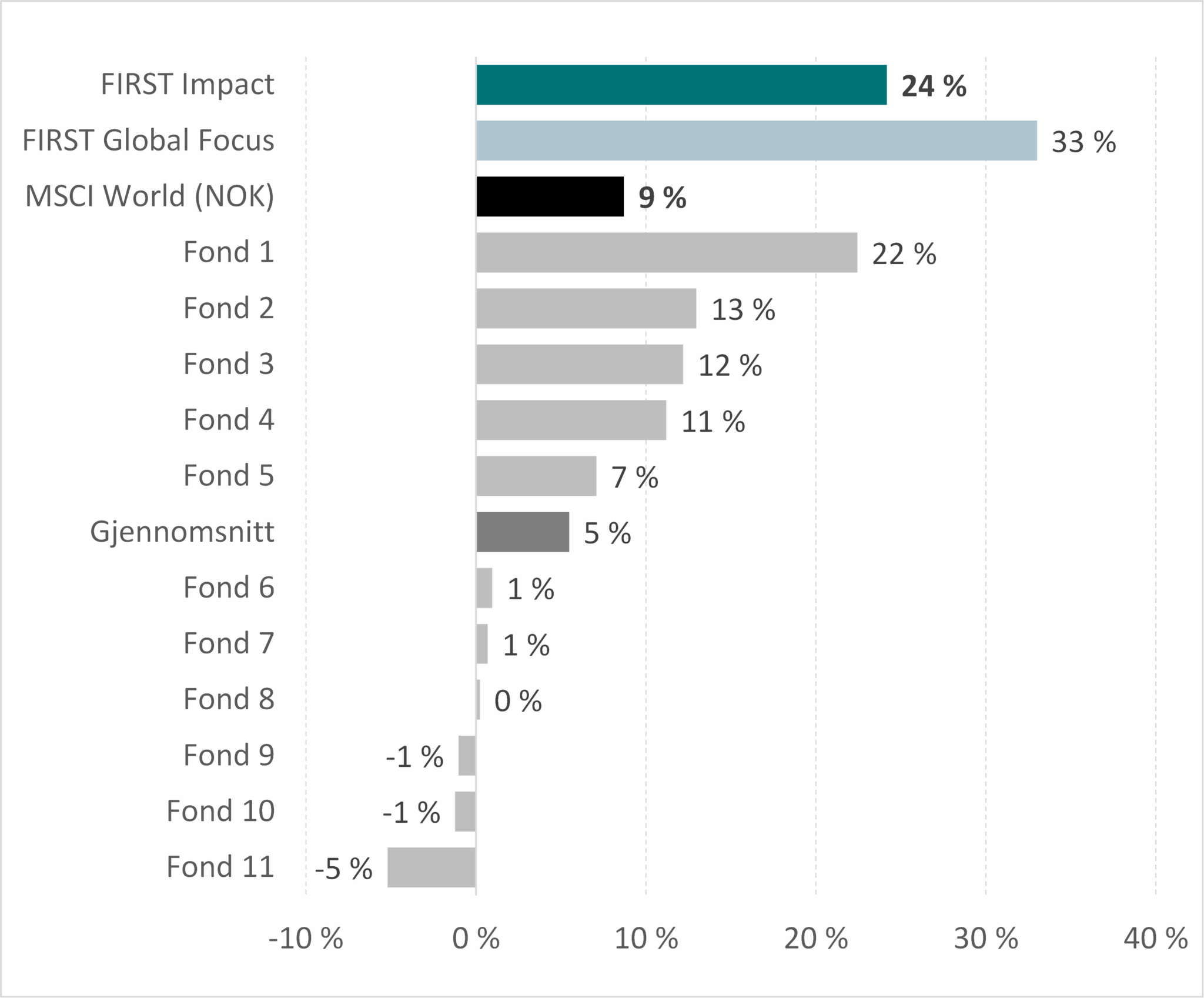 Ser vi på det bredere markedet, hadde de 11 største globale fondene i Norge (ifølge VFF) en gjennomsnittlig avkastning på 5 % i 2025, med en median på 1 %. Fire av de 11 største norske fondene slo verdensindeksen i fjor, i tillegg til FIRST Impact og FIRST Global Focus.