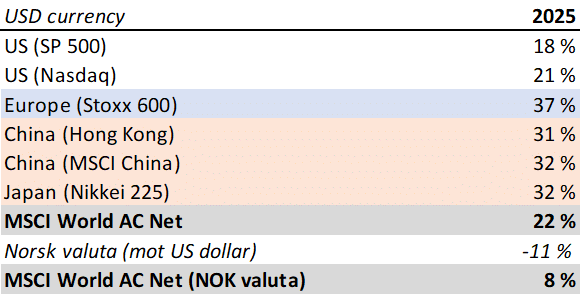 2025 var et volatilt, men sterkt år for verdens børser. MSCI World steg 22 % i lokal valuta. Målt i amerikanske dollar ga markedene en avkastning på 18–21 % i USA, 37 % i Europa og 31–32 % i Asia. For norske investorer ble bildet noe dempet av at dollaren svekket seg med 11 % mot norske kroner, noe som gjorde at verdensindeksen målt i norske kroner, endte på 9 % avkastning.