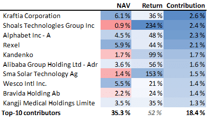 Totalt utgjorde de ti beste bidragsyterne 35 % av NAV og sto for 18 prosentpoeng av fondets avkastning på 24 % i 2025.
