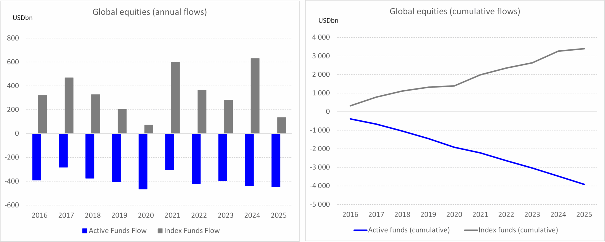 De siste ti årene har aktive fond i USA opplevd netto innløsninger hvert eneste år, mens passive fond har hatt netto tegninger. Siden 2015 har nesten 4 000 milliarder dollar forlatt aktive fond, mens passive fond har mottatt 3 400 milliarder dollar.