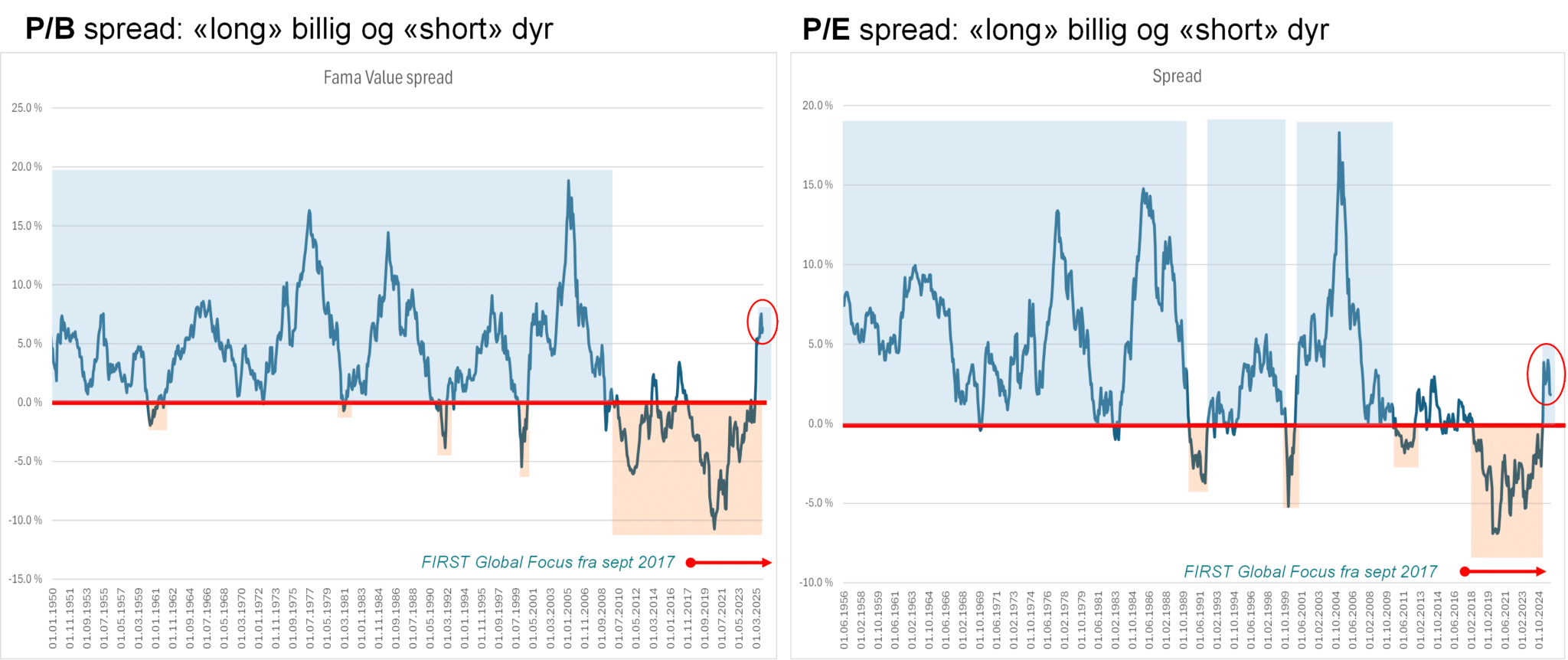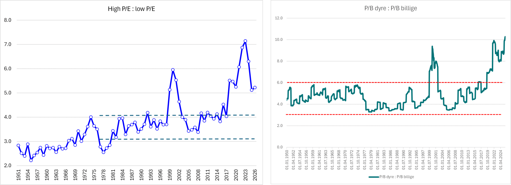 Resultatet er at dyre aksjer sjelden har vært dyrere enn i dag. De 30 % dyreste aksjene prises nå på rekordnivåer, enten man ser på P/E (90 % over historisk median) eller P/B (280 % over!). De billigste aksjene er derimot fortsatt priset lavt.