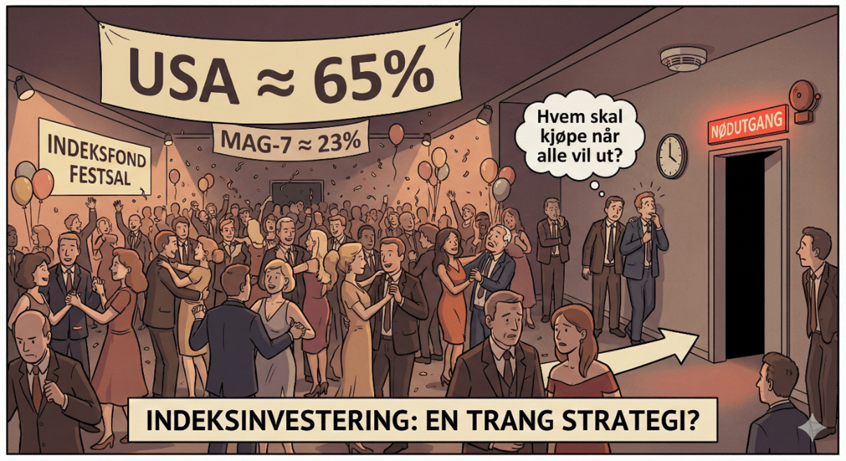Dette gjør indeksinvestering til en svært «trang» strategi med rundt 65% eksponering mot USA og 23% eksponering mot Mag-7. Skulle markedet av en eller annen grunn trigge store innløsninger fra indeksfondene, for eksempel et markedssjokk, så kan kursreaksjonene bli enorme. Indeksfond er kanskje ikke lenger en så lav-risiko strategi, som det engang var?