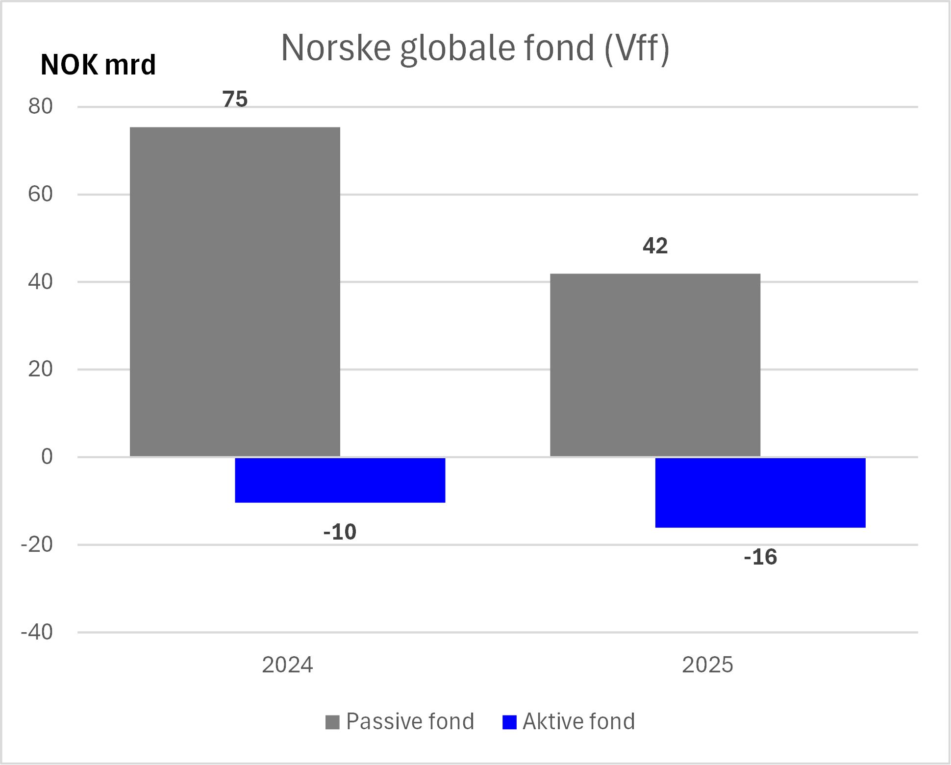 De siste to årene har passive fond i Norge hatt netto tegninger på nesten 120 milliarder kroner, mens aktive fond har hatt netto innløsninger på 25 milliarder.