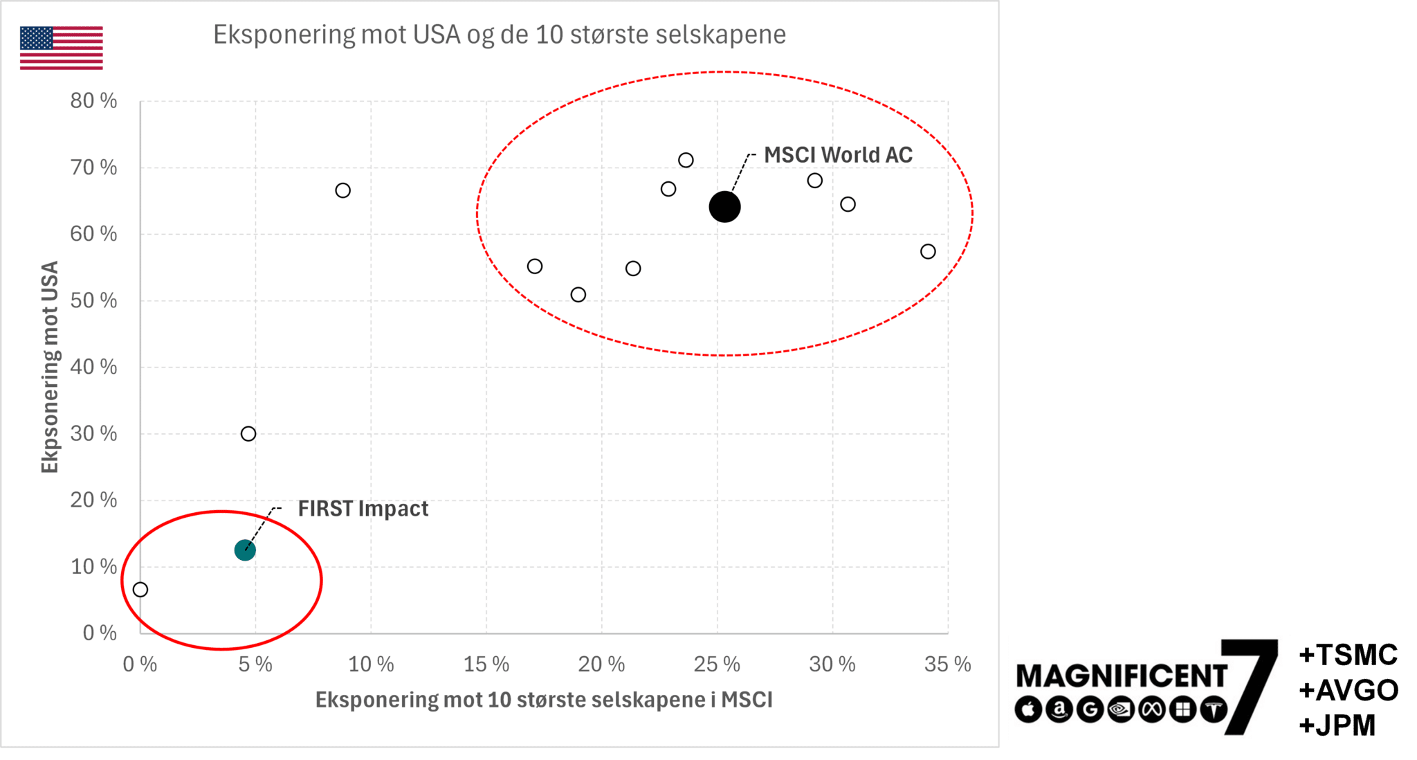 FIRST Impact og ett annet norsk fond skiller seg ut: lav eksponering mot USA og lav eksponering mot de 10 største selskapene i indeksen. Vi kjøper billige aksjer der vi finner dem – og i dag finner vi dem verken i USA eller blant verdens ti høyeste verdsatte selskaper.