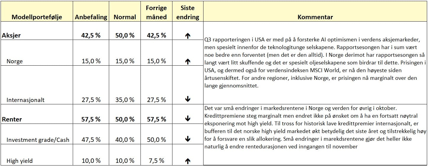 Undervekt internasjonale aksjer, spesielt ved å undervekte amerikanske aksjer, er en strategi som videreføres inn i november. Samtidig har vi nøytralvekt i norske aksjer og high yield.