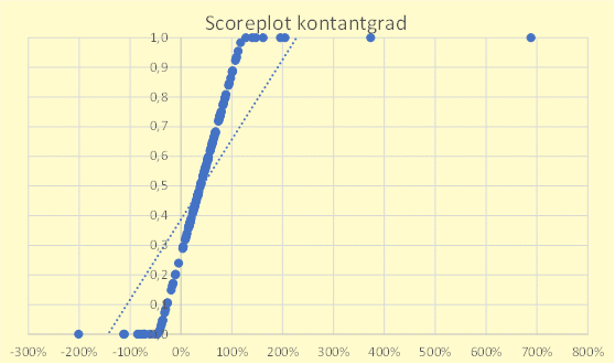 Kontantgrad (tidligere kalt cash-conversion) er også linjær (som tidligere) og har en øvre grense på 120% som gir maks score. De selskapene med kontantgrad over 120% skyldes i sin helhet at EPS (nevner i brøken) er nær 0 og nøkkeltallet kan gå mot mot uendelig. Noen få selskaper kan ha kontantgrad >100% over tid pga f.eks negativ arbeidskapital eller at de har solgt ut virksomhet, men jeg har til gode å se at det er veldig mye høyere enn 100%, derav grense som nevnt. Det er også en nedre grense her.