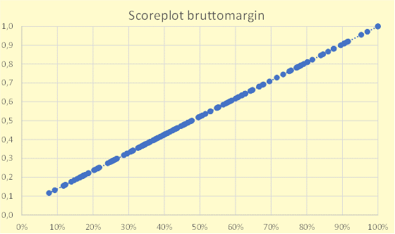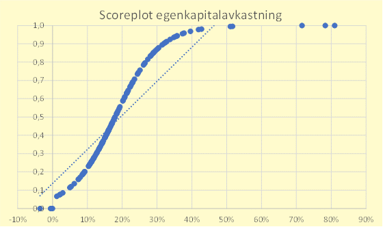 Tidligere har scoren være basert på antall standardavvik fra snittet hvert selskap har hatt på hvert parameter. Siden parametrene følger ulike fordeling helt naturlig, vil enkelte parametre gi store standardavvik til enkelte selskaper, mens andre parametre har mindre standardavvik. Dette gir implisitt en mer ulik vekting av parametrene enn jeg eksplisitt gjør gjennom min diskresjonære vekting (25% lønnsomhet, 25% innvannende vekst, 25% robusthet og 25% verdsettelse). Derfor gir alle parametre heretter en score der 0 er dårligst og 1 er best. Snittet per parameter er definert til 0.5 som også dermed bestemmer bratthet på kurven. Totalscoren til et selskap vil også være på samme skala (men jeg har multiplisert med 100 bare for å slippe masse desimaler). Grafene under viser fordeling blant de 149 selskapene i modellen med utfall per parameter.