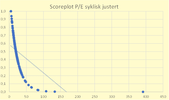 Verdsettelse (syklisk justert P/E) følger nå en eksponesielt avtagende funksjon som følger prinsippet om at jo høyere P/E er, jo mindre endrer grafen seg. Dette er egentlig bare en litt annen måte å gjøre det på sammenligna med å bruke både P/E og E/P som jeg gjorde tidligere, men da er det altså bare et parameter i formelen. Det er større forskjell mellom P/E 10x og 20x enn 60x og 70x, noe funksjonen hensyntar.