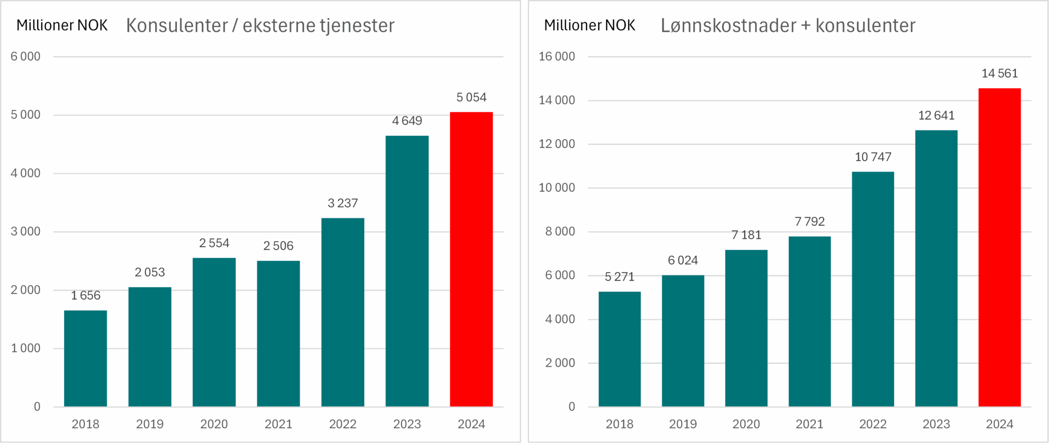 Logisk sett skulle en dobling av staben redusere behovet for eksterne konsulenter. Tvert imot har Statkraft klart kunststykket å nesten tredoble konsulentbruken til astronomiske 5 milliarder krone i 2024! Får de nyansatte i Statkraft en McKinsey-konsulent i gave første arbeidsdag?